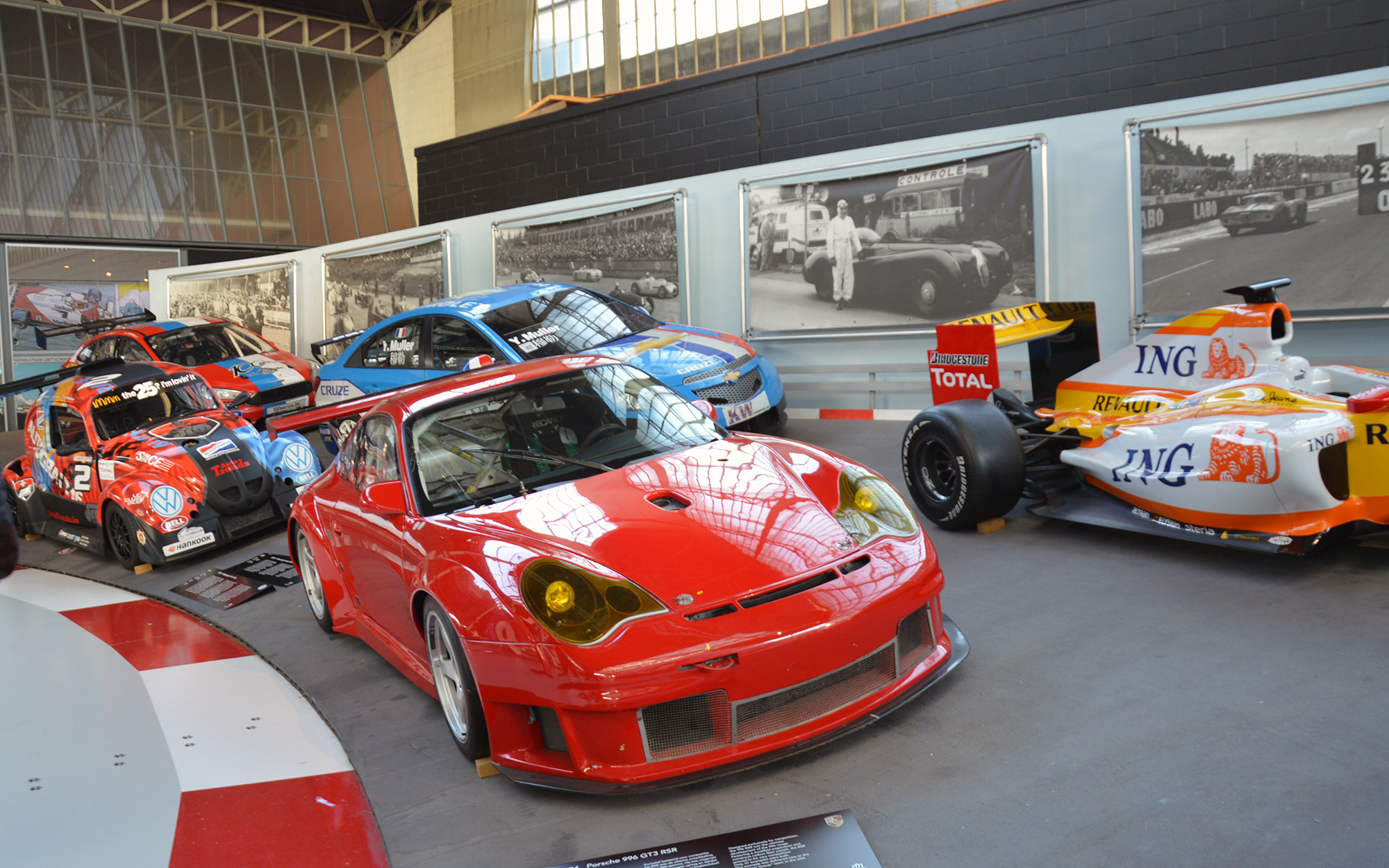 Idąc dalej można zanurzyć się w świecie motorsportu. Ponad 20 samochodów wyścigowych (F1, GT, rajdowe) zaprezentowanych jest w dynamicznej scenerii z podniesionym zakrętem, polami startowymi i historycznymi padokami.
