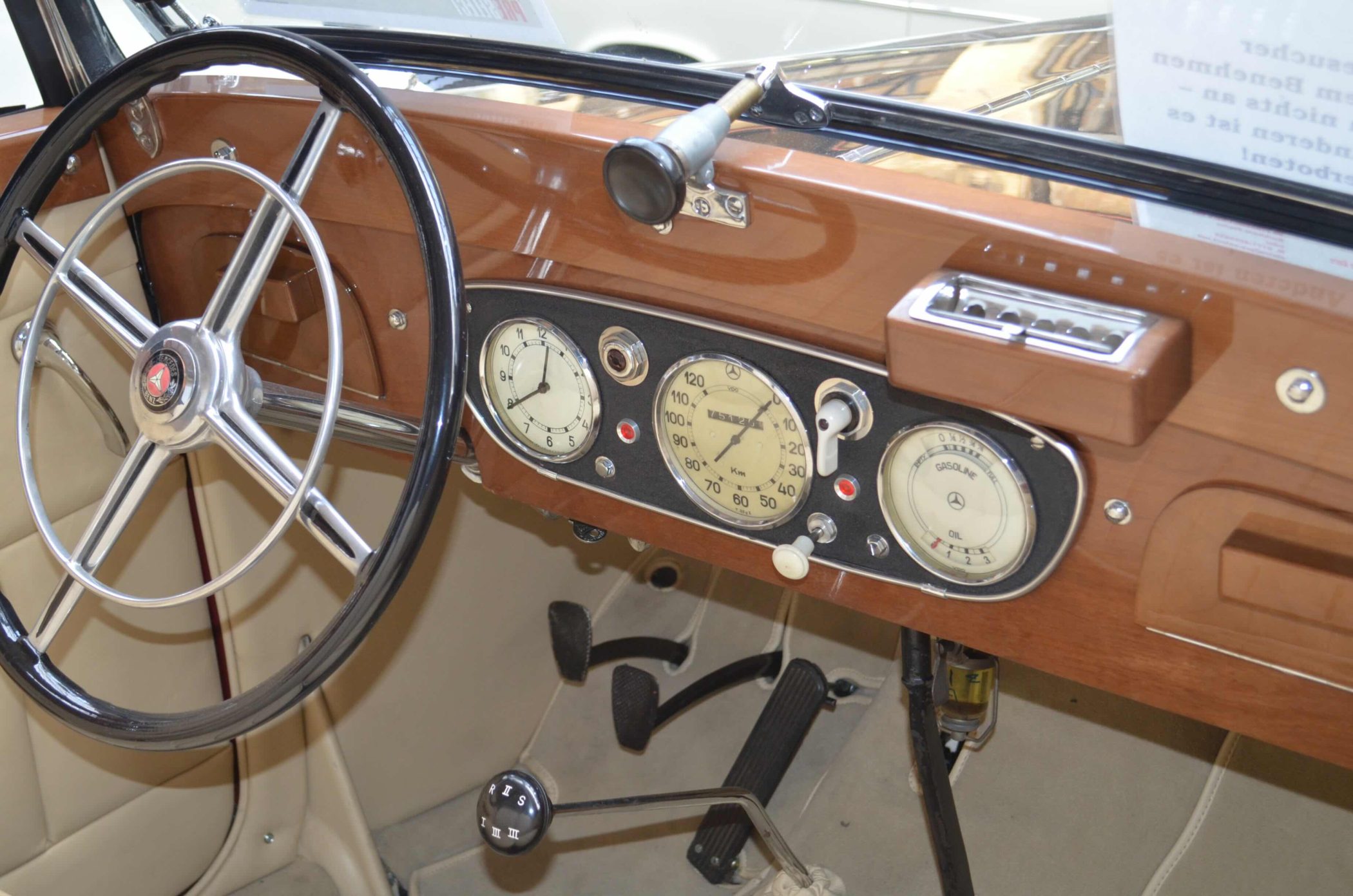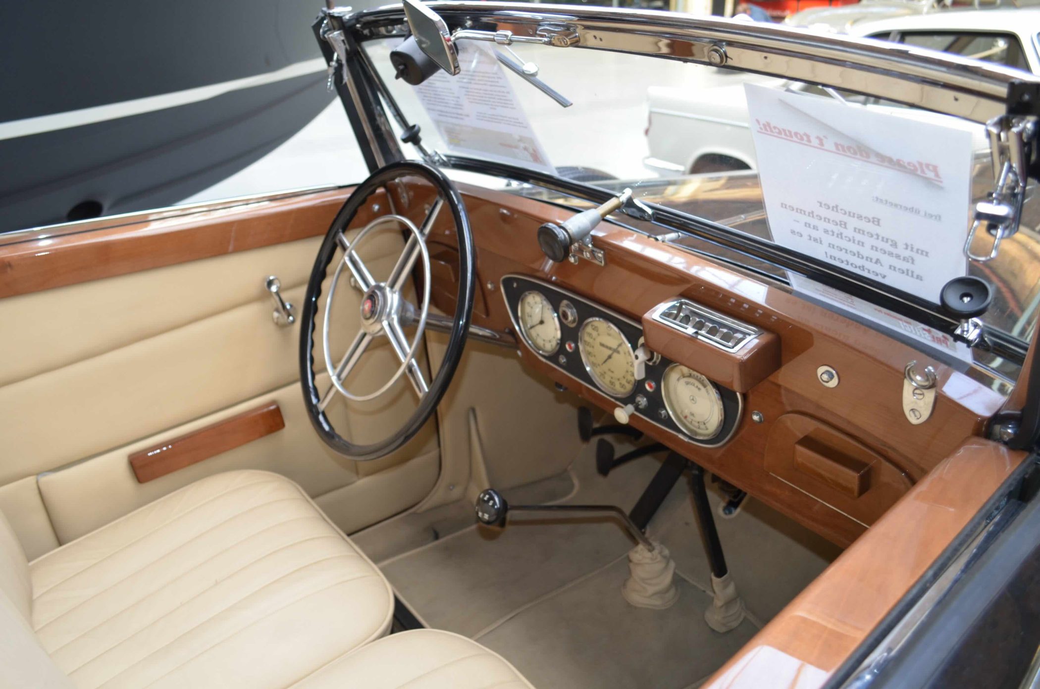 The interior of the Mercedes-Benz 200 W21 Cabriolet B was crafted to the highest standards of its time. Natural leather, high-quality fabrics, wooden trim, and chrome accents were commonly used. The dashboard was simple yet elegant, featuring large, easy-to-read instruments.