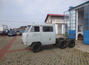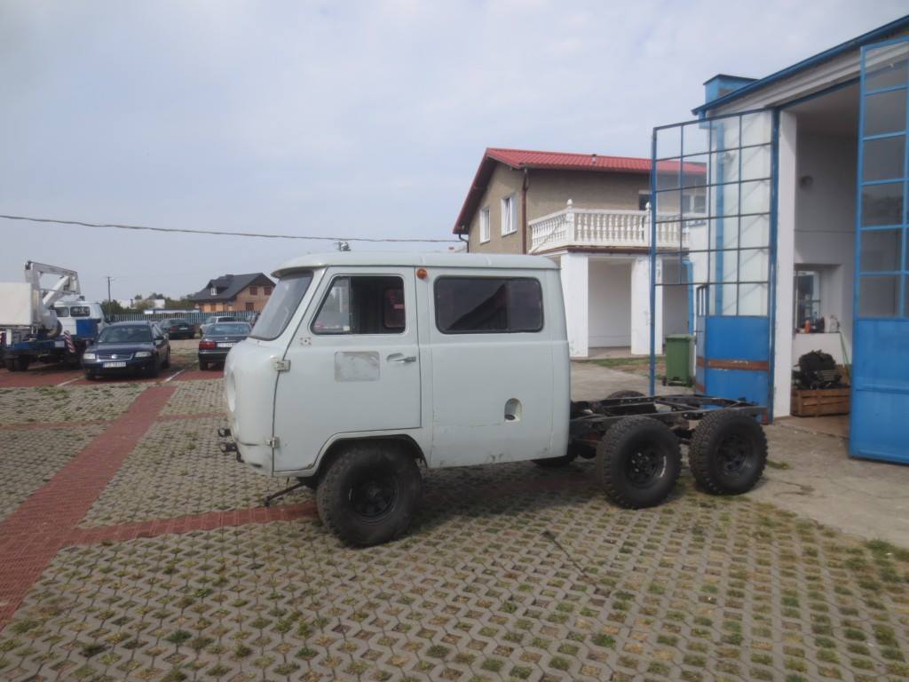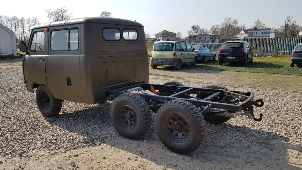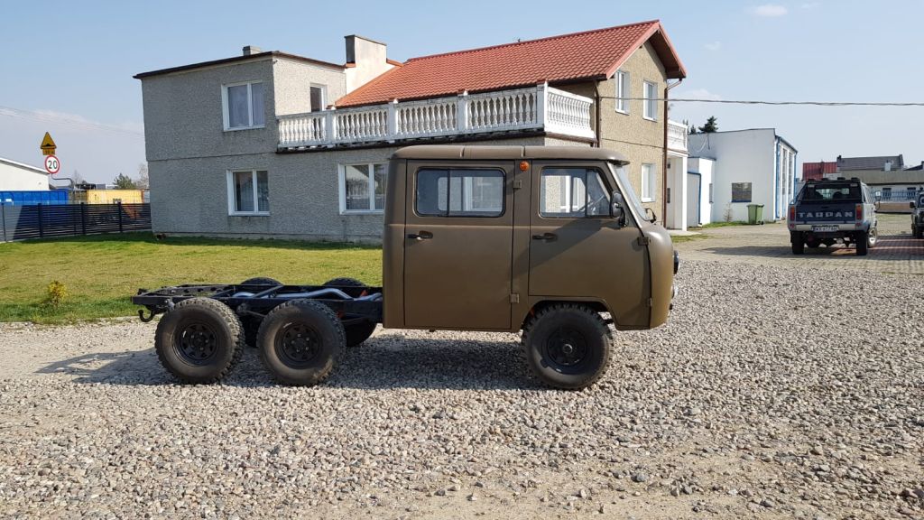 W tym przypadku zgłosił się do nas klient z zagranicy, który poprosił o przerobienie podwozia swojego UAZ-a 452 na wersję z napędzaną trzecią osią. Dodatkowo zlecił dostarczenie, renowację i montaż nadwozia typu „doka”, czyli z podwójną kabiną, zamiast typowego wariantu BUS.