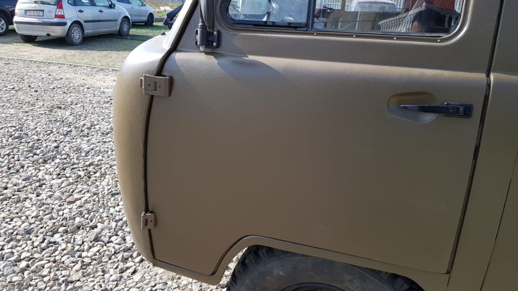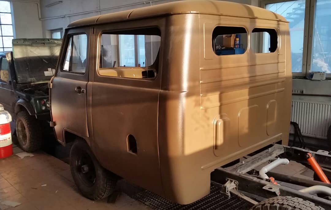 After several months of searching, we managed to source a double-cab body. It required bodywork and paint restoration, which we carried out thoroughly. At the client’s request, the UAZ was painted in a green, thick-structured protective coating to withstand heavy off-road conditions.