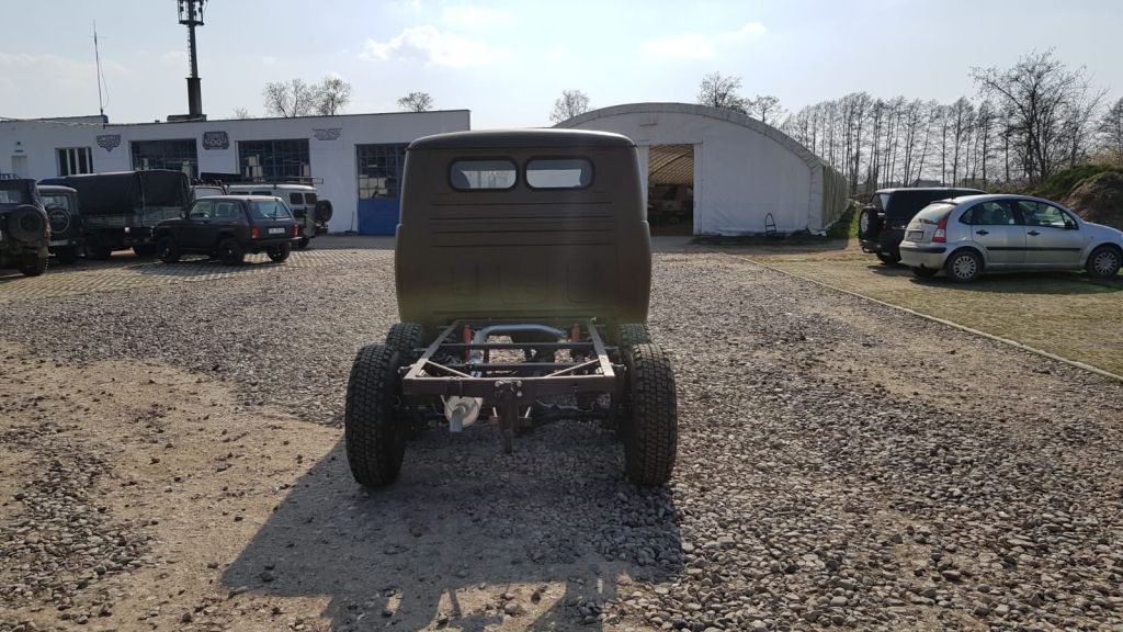 Po kilku miesiącach poszukiwań udało się zdobyć nadwozie typu doka, które wymagało jednak renowacji blacharskiej i lakierniczej. Na życzenie klienta pomalowaliśmy pojazd zieloną farbą ochronną o gęstej strukturze, zapewniającą trwałość w trudnych warunkach terenowych.
